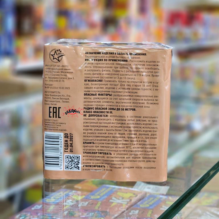 Магазин пиротехники БаБАХыч продает всю пиротехнику с минимальной наценкой. Если Вы встретили такой-же салют по более низкой цене, перед покупкой обязательно проверяйте срок годности, ведь чем дольше срок годности, тем ярче, красочнее и безопаснее салют (при длительном хранении звездки в салюте теряют яркость, а вышибной заряд впитывает влагу). Запускать просроченные батареи салютов опасно для жизни!
